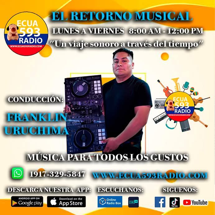 Sintoniza nuestro programa en vivo El Retorno Musical, conducción Franklin Uruchima de Lunes a Viernes de 8:00am a 12:00 pm hora de Nueva York, desde el Cantón Déleg, Ecuador.